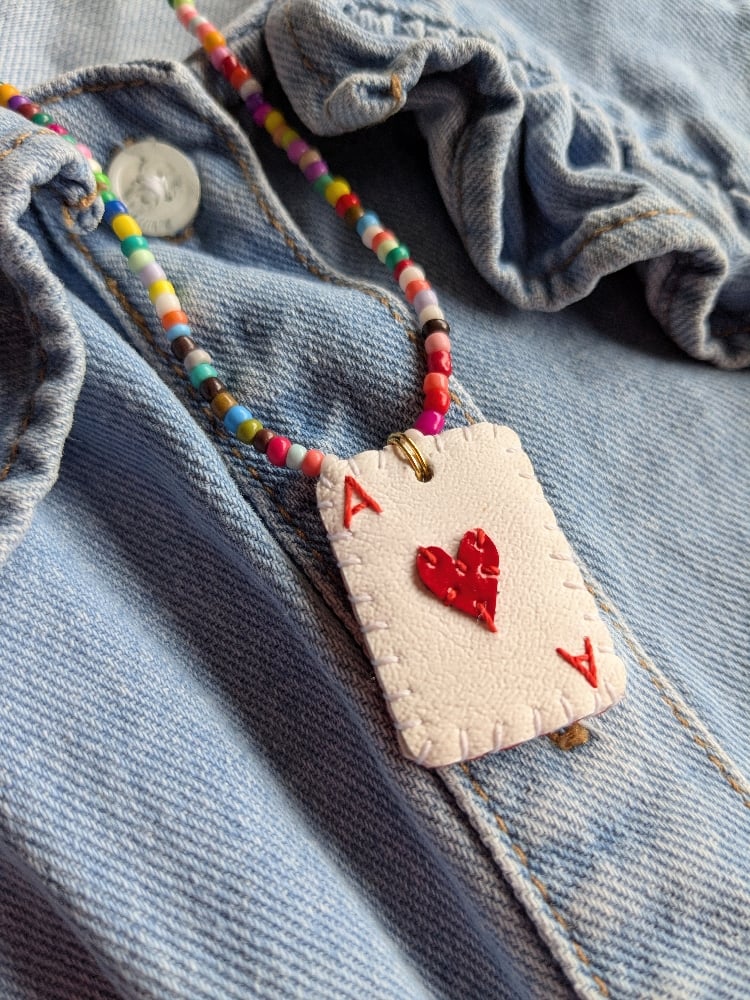 * An Ace of Hearts playing card on a multicoloured glass seed bead necklace