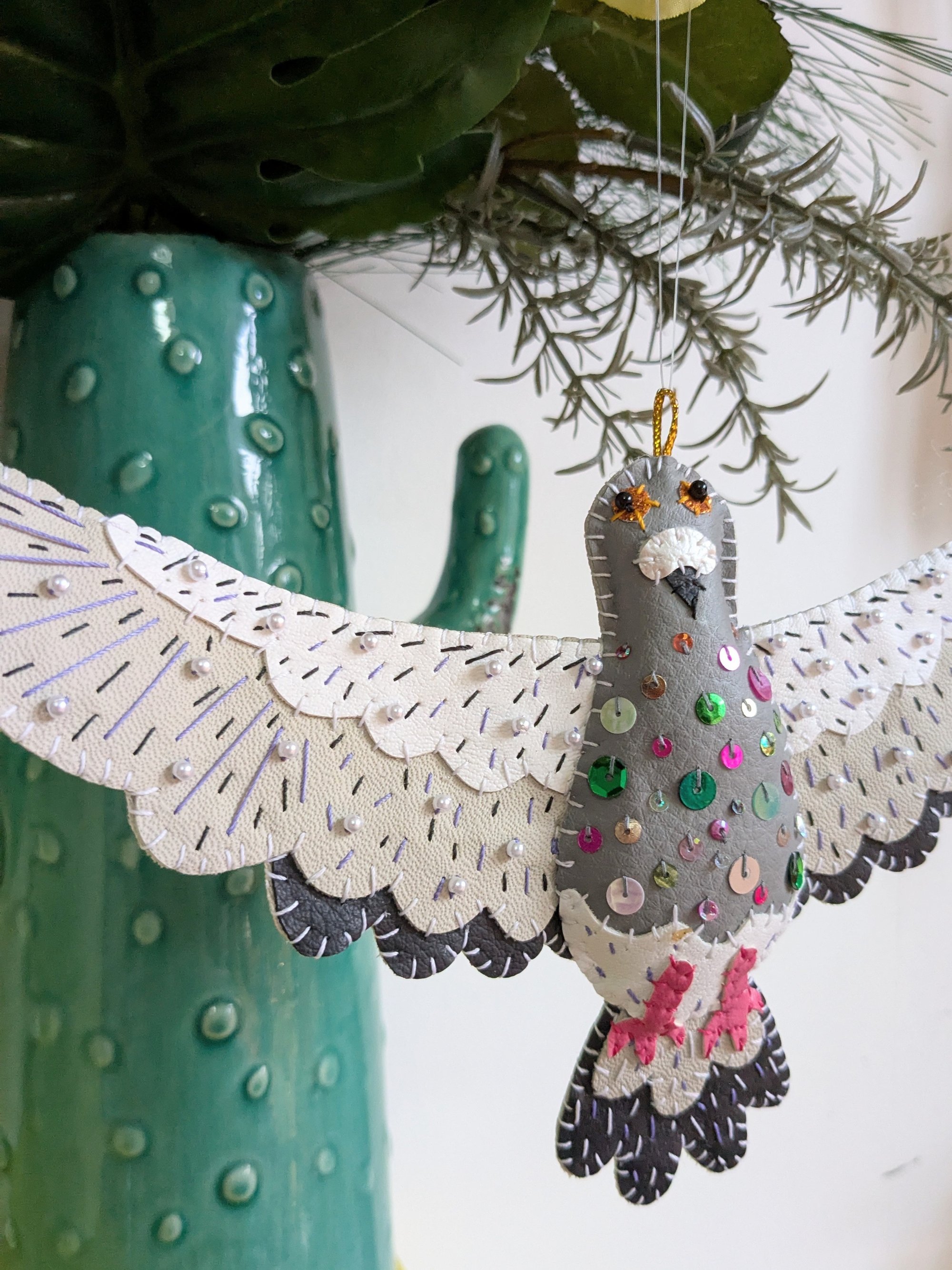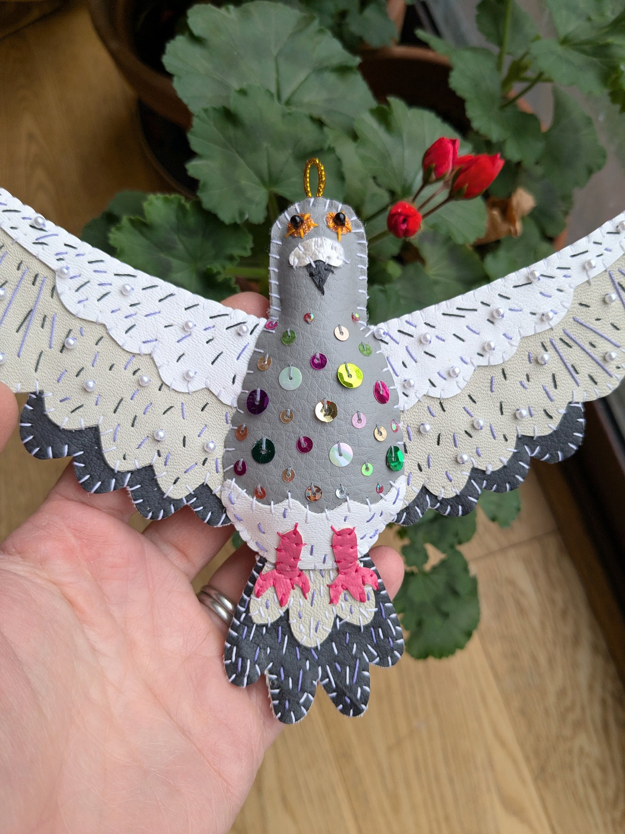 * Made from faux leather, with hand stitched orange glitter and black bead eyes, pearl bead detail and sequin embellished chest