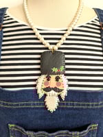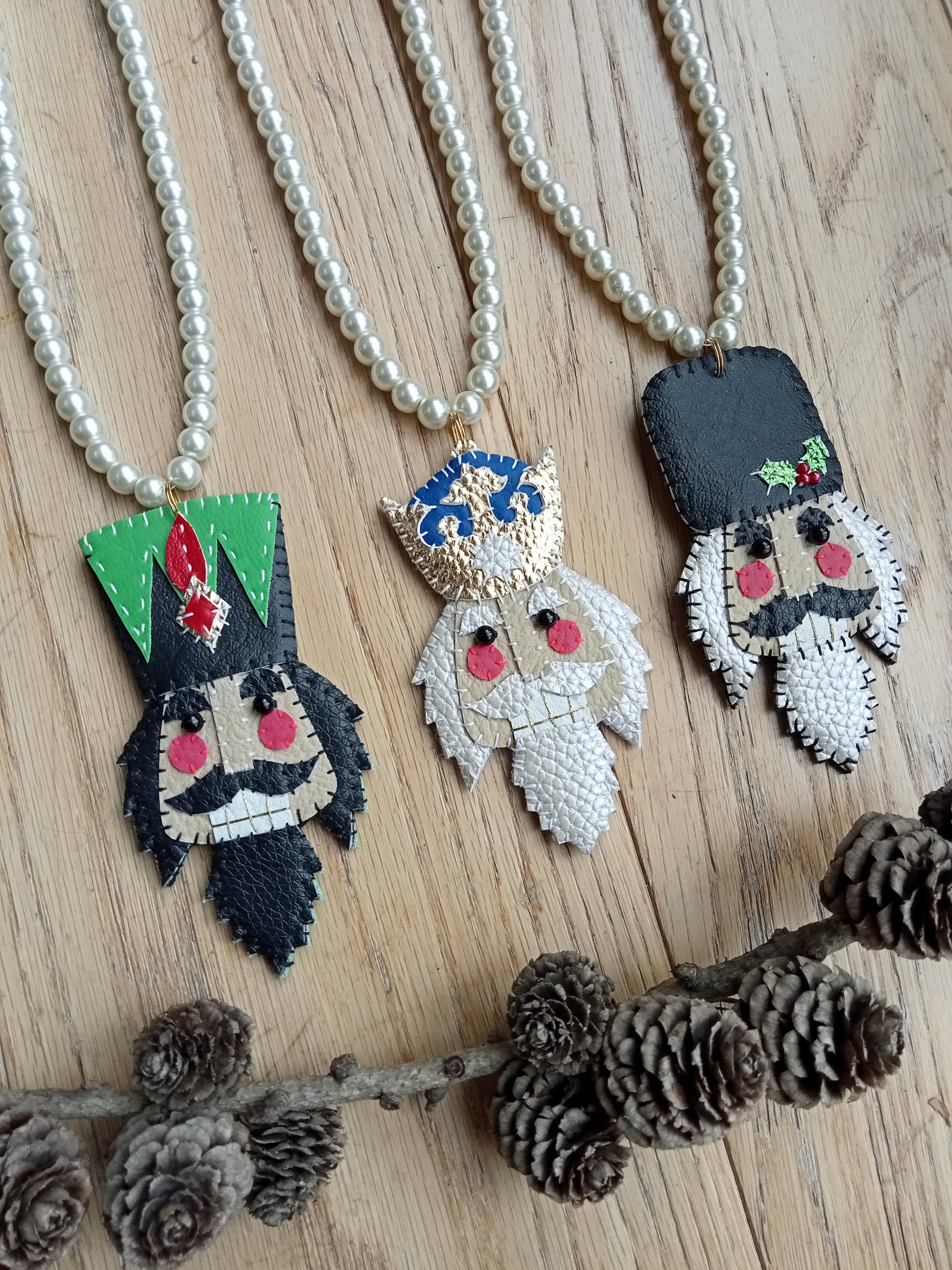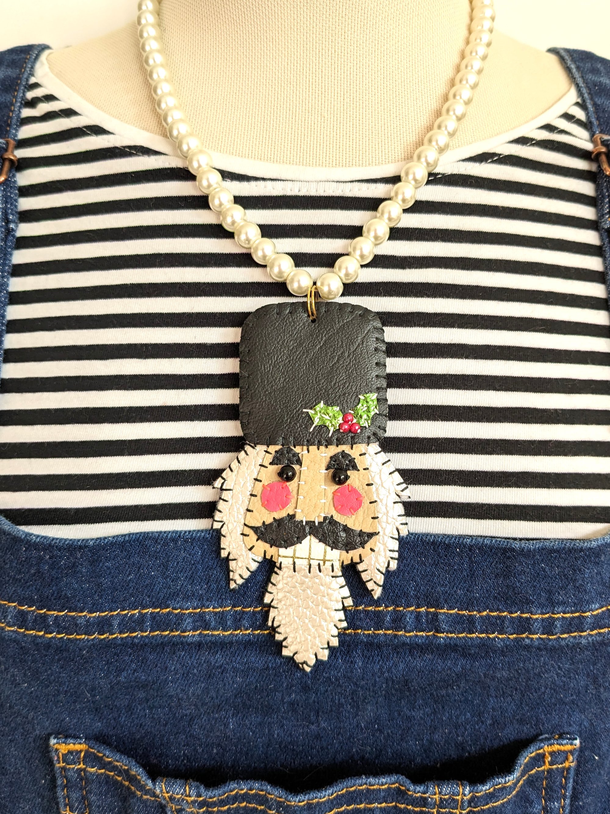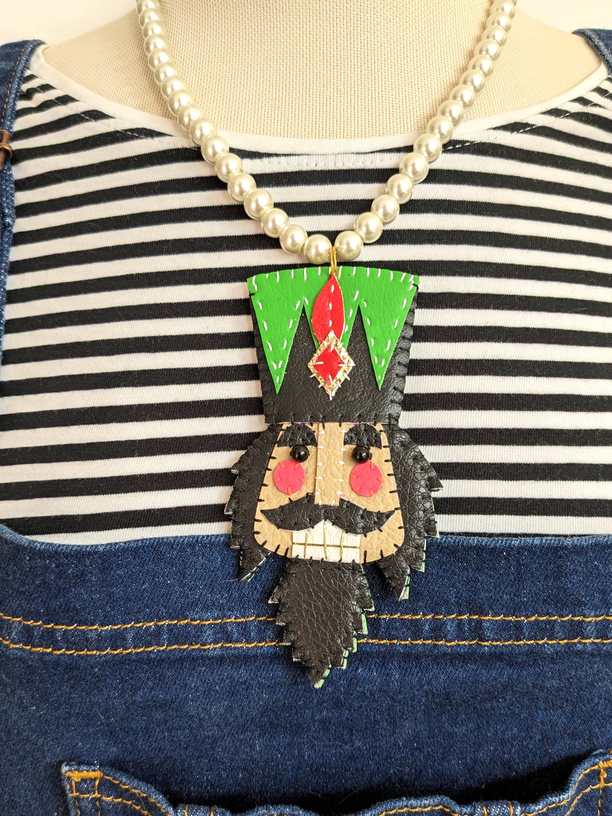 * Hand stitched leatherette nutcracker necklace with black bead eyes and metallic detail
