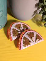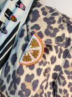 * Hand stitched orange and pearlescent white faux leather, with glitter fabric and pearly tear shaped 'pips'